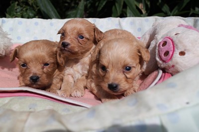 全体的にはクリームかアプリコットです。兄弟の中に頭に白が入っている仔犬もいます。